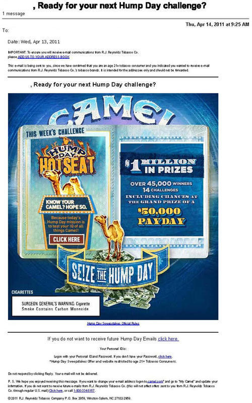 Email sent on April 13, 2011 promoting week 2 of Camel Hump Day, a sweepstakes which visitors can enter weekly (through early July 2011) for a chance to win $50,000. Upon entering, participants are offered various fun online “challenges”, such as trivia questions about Camel. Participants can also enter for Instant Win prizes daily.