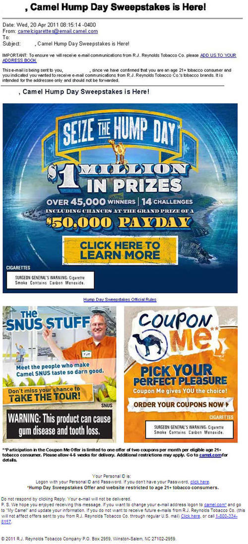 Email sent on April 20, 2011 promoting Camel Hump Day, a sweepstakes which visitors can enter weekly (through early July 2011) for a chance to win $50,000. Upon entering, participants are offered various fun online “challenges”, such as trivia questions about Camel. The e-mail also invites receivers to "take a tour" behind the scenes and learn about the making of Camel Snus, and promotes the Coupon Me program, which allows customers to order coupons online.