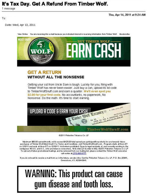 Email received from Timber Wolf in April 2011 using the theme of Tax Day to promote a new loyalty promotion. Customers can earn cash by visiting the brand's website and entering codes found in cans of Timber Wolf. Each code entered online is worth 25 cents and customers can earn up to $125 for the year. "It's Tax Day. Get a refund from Timber Wolf. Get a return without all the nonsense."