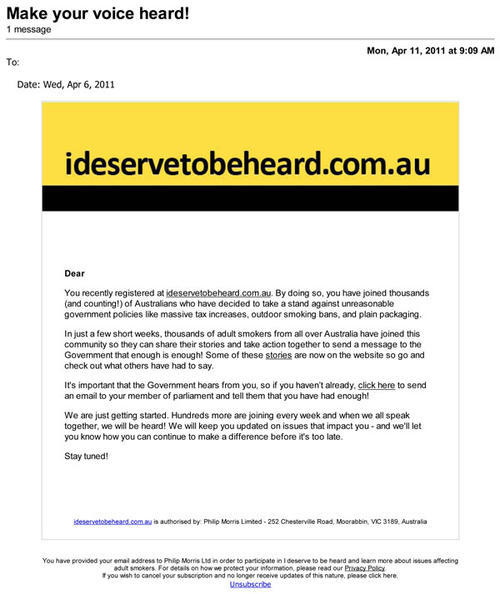 Email sent from Philip Morris to a receiver in Australia promoting a smokers' rights website, ideservetobeheard.com.au. The e-mail suggests the receiver should contact their member of parliament and "tell them that you have had enough!" E-mail belongs to the company's "I deserve to be heard" campaign.