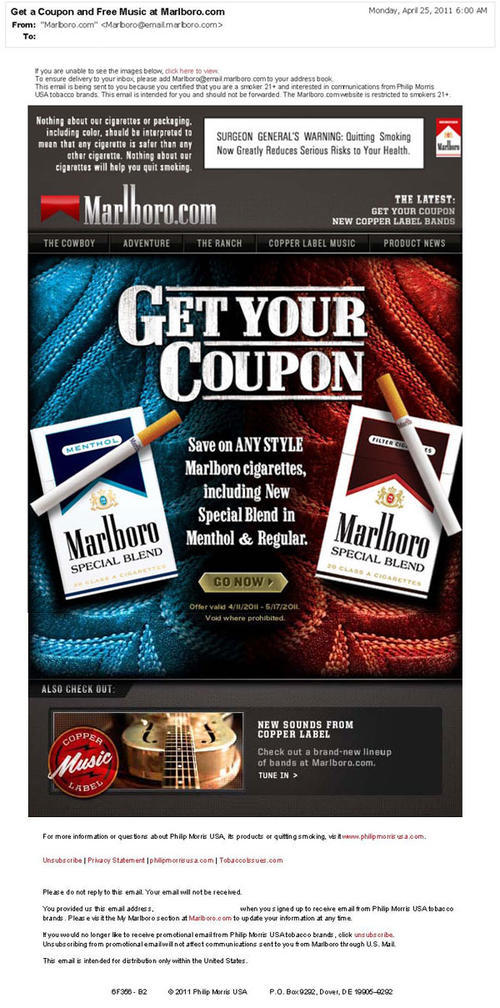 Email from Marlboro advertising its Special Blend cigarette line extension and promoting a coupon offer. The e-mail also advertises that new featured bands and free music can be found at Marlboro.com