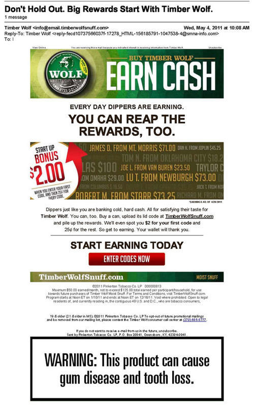 Email received from Timber Wolf in May 2011 advertising a brand loyalty promotion. Customers can earn cash by visiting the brand's website and entering codes found in cans of Timber Wolf. Each code entered online is worth 25 cents and customers can earn up to $125 for the year. "Every day dippers are earning. You can reap the rewards, too."
