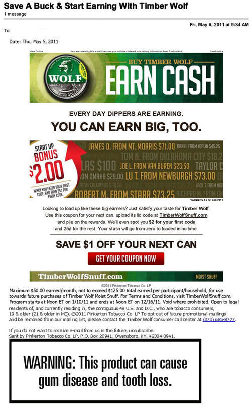 Email received from Timber Wolf in May 2011 advertising a brand loyalty promotion. Customers can earn cash by visiting the brand's website and entering codes found in cans of Timber Wolf. Each code entered online is worth 25 cents and customers can earn up to $125 for the year. "Every day dippers are earning. You can earn big, too."