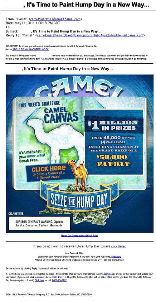 Email sent on May 11, 2011 promoting Week 7 of Camel Hump Day, a sweepstakes which visitors can enter weekly (through early July 2011) for a chance to win $50,000. Upon entering, participants are offered various fun online “challenges”, such as the "Camel Canvas" challenge, which invites users to let their "inner artist break free" and create their own Camel Design. Participants can also enter for Instant Win prizes daily.