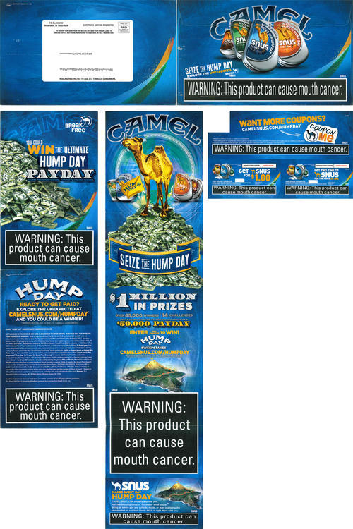 Direct mail received in May 2011 promoting Camel Snus and Camel Hump Day, a sweepstakes which visitors can enter weekly (through early July 2011) for a chance to win $50,000. Upon entering, participants are offered various fun online “challenges”, such as Camel trivia, word scrambles and games. Participants can also enter for Instant Win prizes daily. The mailing comes with two Snus coupons (one for $1.00 off and one buy-one-get-one-free snus coupons).