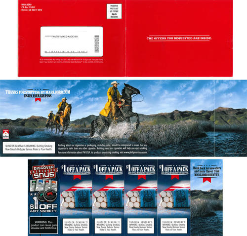 Direct mail received in April 2011 featuring an image of a cowboy and providing cigarette and snus coupons, based on a coupon offer presented on the brand's website. "Thanks for stopping by Marlboro.com. Enjoy your coupons."
