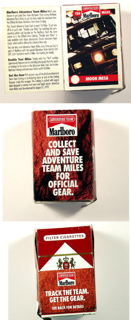 2 packs of Marlboro red promotion announcing adventure team miles for gear.