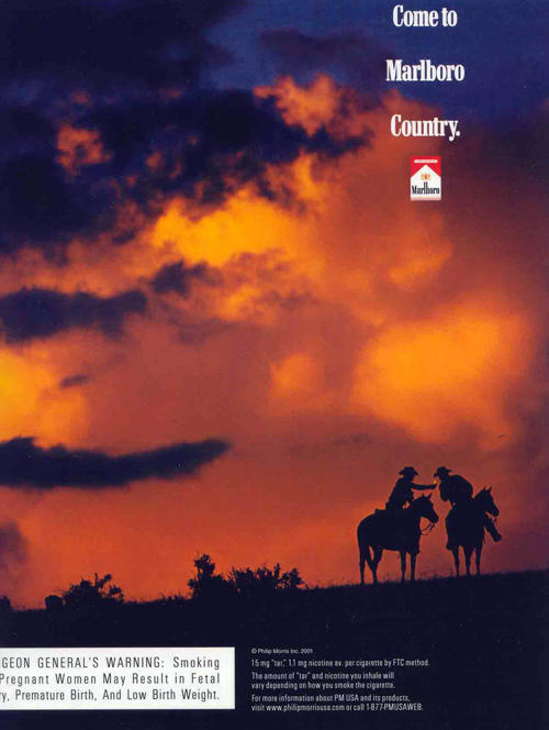 Marlboro ad featuring an image of one cowboy lighting another cowboy's cigarette, with a purple, red and orange colored sky background.