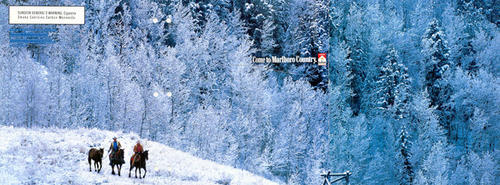Three page Marlboro ad featuring three cowboys crossing a snowy terrain.