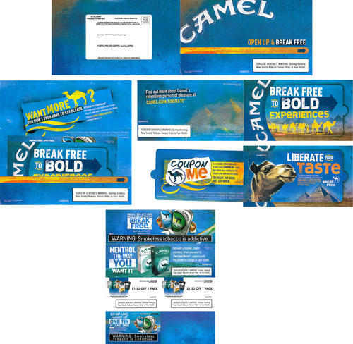 The piece also features an image of a camel and uses the slogan "liberate your taste". It includes an ad for Camel Menthol cigarettes, includes two cigarette coupons (each for $1.50 off a pack) and includes one coupon for a free tin of Camel Snus with the purchase of any Camel product.