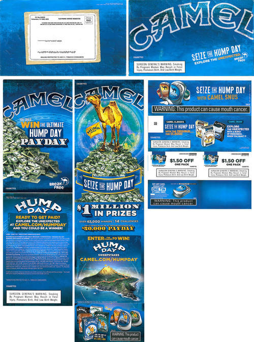 Direct mail received in May 2011 promoting Camel Hump Day, a sweepstakes which visitors can enter weekly (through early July 2011) for a chance to win $50,000. Upon entering, participants are offered various fun online “challenges”, such as Camel trivia, word scrambles and games. Participants can also enter for Instant Win prizes daily.