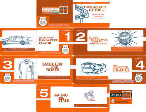 Direct mailing in promotion of Taboka, a smokeless tobacco product launched for test marketing by Philip Morris in 2006. The mailing includes a "Tuckability guide" to using the product and a coupon for a free trial pack.