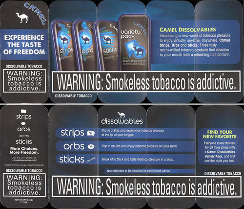 Point of sale ad introducing and describing Camel Dissolvables, smokeless tobacco products which were revised and reintroduced into test-marketing in select cities in 2011. The products are available in the forms of Orbs, Sticks and Strips, and sold in a variety pack of all three forms.
