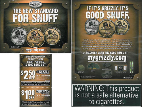 Direct mail from Grizzly promoting three product styles (1900 Long Cut, Snuff Pouches and regular Grizzly Snuff) and the brand's website (mygrizzly.com), where users can play games, enter a sweepstakes and download coupons. Piece includes two coupons and a postcard/survey to pass on to friends "so they too can get in on great offers from Grizzly". Text: "The New Standard for Snuff". "If it's Grizzly, it's good snuff."