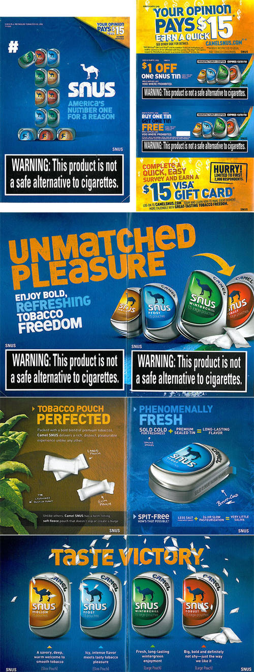 Direct mail in promotion of Camel Snus, referred to as being America's #1 Snus "for a reason". The mailing describes different attributes of the product, including its pouch style and spit-free characteristic. Text: "Taste victory." "Unmatched Pleasure".