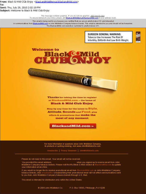 Email from Black & Mild, sent in July 2010, thanking the receiver for signing up with the brand and welcoming the receiver to the brand's "Club Njoy". Text: "Thanks for taking the time to register at BlackandMild.com - the home of Black & Mild Club Enjoy. Stop by any time for the latest in style, attitude, sounds and food, plus offers & promotions that make the most of any moment."