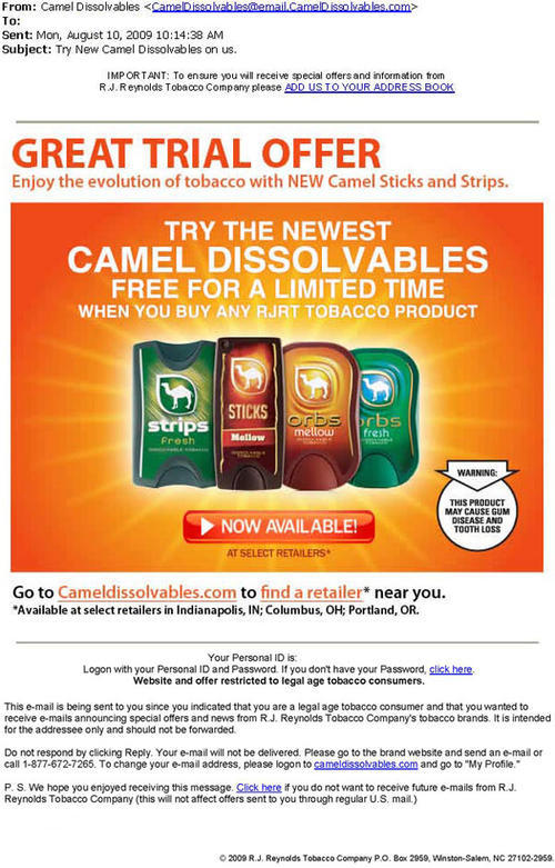 Email sent in August 2009 in promotion of trial offers for Camel Dissolvables. Text: "Try the newest Camel Dissolvables free for a limited time when you buy any RJRT tobacco product"