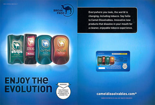 Two page ad in promotion of Camel Dissolvables - three new types of tobacco products from Camel made of finely milled tobacco. The products are in test-market in Columbus, Ohio, Indianapolis, IN and Portland, Oregon. Ad text: "Enjoy the evolution." This ad features a coupon for a free pack of Camel Dissolvables with the purchase of any tobacco product.