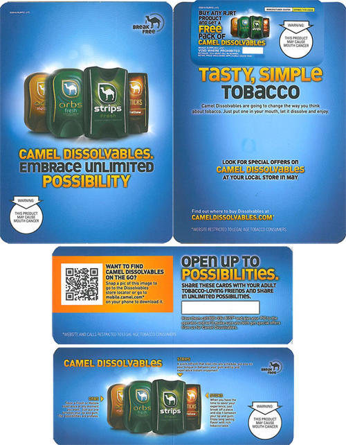 Direct mailing in promotion of Camel Dissolvables - three types of tobacco products from Camel made of finely milled tobacco. Styles include Camel Strips, Camel Sticks and Camel Orbs. Text: "Embrace Unlimited Possibility. Tasty, Simple Tobacco".