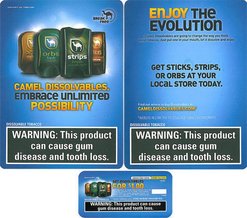 Direct mailing in promotion of Camel Dissolvables - three types of tobacco products from Camel made of finely milled tobacco. Styles include Camel Strips, Camel Sticks and Camel Orbs. Text: "Embrace Unlimited Possibility. Enjoy the Evolution".