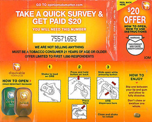 Camel Dissolvables instruction sheet for using and opening Camel Orbs. Information included with Camel Orbs pack. Sheet also includes offer to earn $20 by completing an online opinion survey.