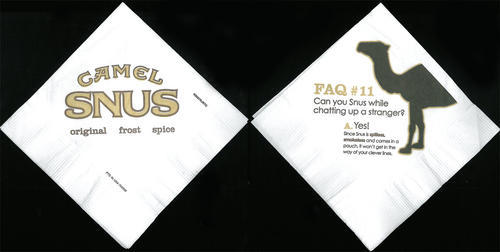 Camel branded napkin in promotion of Camel Snus. Text: "FAQ#11 - Can you SNus while chatting up a stranger? A. Yes! Since Snus is spitless, smokeless and comes in a pouch, it won't get in the way of your clever lines."