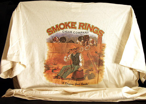 Ten Smoke Rings Cigar Company T-shirt, "A doggon good smoke". Cowboy picture on back puffing on a cigar, blowing smoke rings, with bored dogs looking on.
