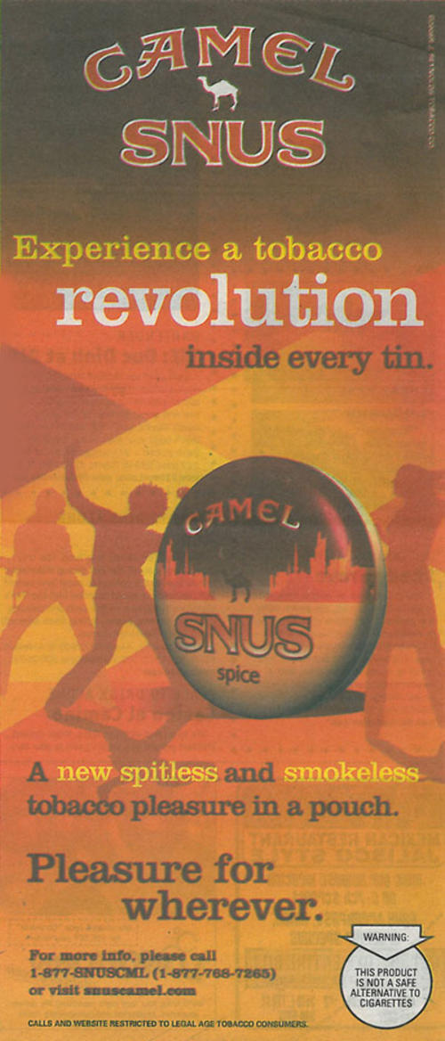 Half page ad in promotion of Spice flavored Camel Snus. Text: "Experience a tobacco revolution inside every tin. A new spitless and smokeless tobacco pleasure in a pouch. Pleasure for wherever."