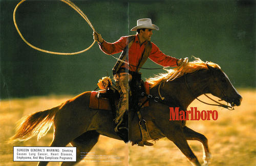 Two page Marlboro ad featuring a cowboy on a horse swinging his rope.