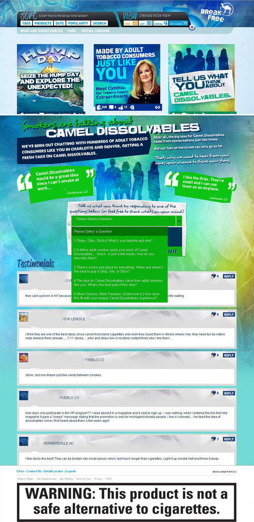 Web pages recorded in July 2010 from the brand website of Camel Dissolvables, asking site visitors to share their opinion about the product. Text: "Tell us what YOU think about Camel Dissolvables."