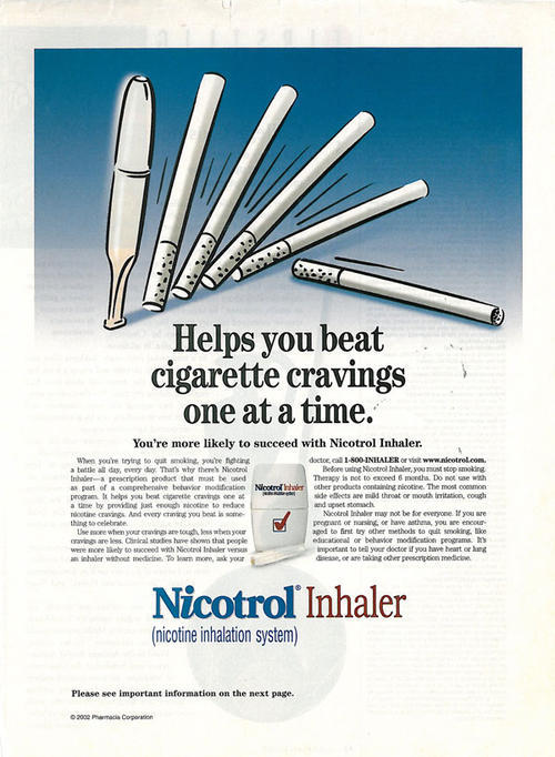 Ad for Nicotrol inhaler. Text: "Helps you beat cigarette cravings one at a time. You're more likely to succeed with Nicotrol Inhaler."