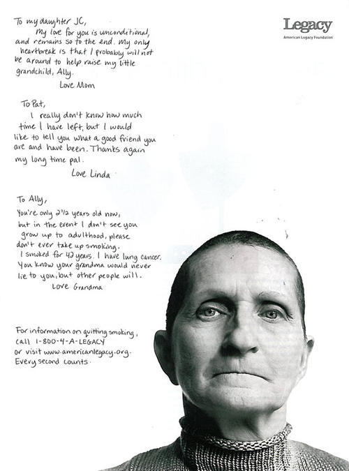 Anti-tobacco ad sponsored by the American Legacy Foundation featuring an image of a cancer patient and written goodbye notes to loved ones.