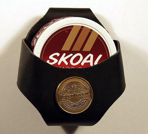 Leather carry case for a tin of Skoal Cinnamon. Case has Gold Circle with Copenhagen logo "Since 1822 it satisfies".