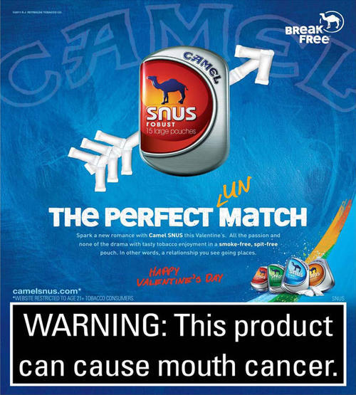 Valentine's Day themed ad for Camel Snus, featuring pouches in the shape of Cupid's arrow. Text: "The Perfect (Un)Match". "Spark a new romance with Camel Snus this Valentine's. All the passion and none of the drama with tasty tobacco enjoyment in a smoke-free, spit-free pouch. In other words, a relationship you see going places."