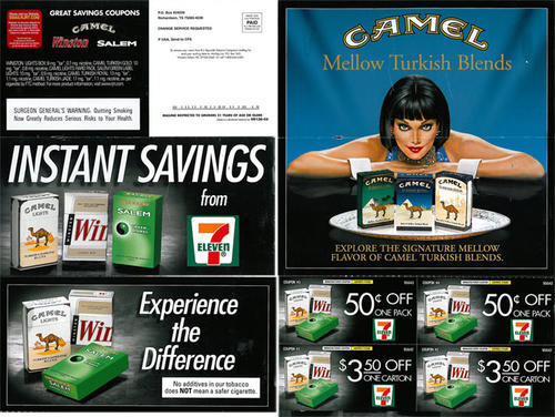 Direct mail promoting and providing coupons for three brands of cigarettes made by RJ Reynolds - Camel, Winston and Salem. The coupons are good in participating 7-11 convenience stores. The piece also includes an image advertising Camel's Turkish Blends line extension.