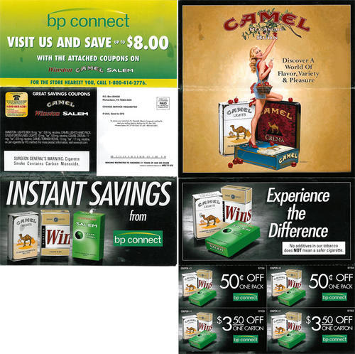 Direct mail promoting and providing coupons for three brands of cigarettes made by RJ Reynolds - Camel, Winston and Salem. The coupons are good in participating BP connect convenience stores. The piece also includes a fall themed image featuring a woman picking applies and advertising Camel's different product styles.
