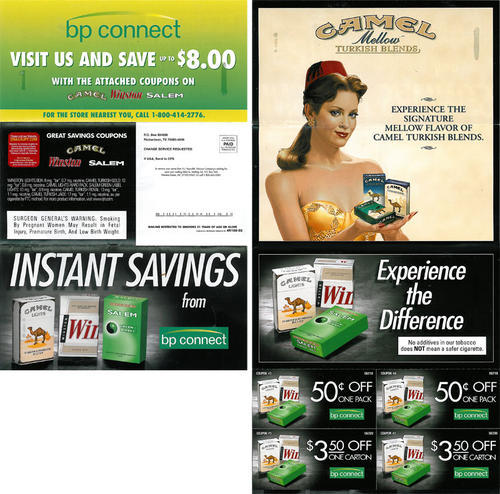 Direct mail promoting and providing coupons for three brands of cigarettes made by RJ Reynolds - Camel, Winston and Salem. The coupons are good in participating BP Connect convenience stores. The piece also includes an image advertising Camel's Turkish Blends line extension.