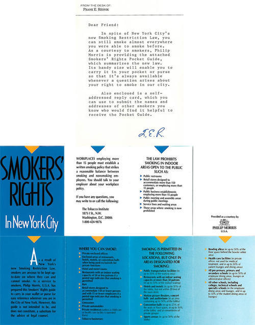 Direct mail from Philip Morris to a smoker in New York City, proving a booklet summarizing the recent smoking ban law passed in the city.