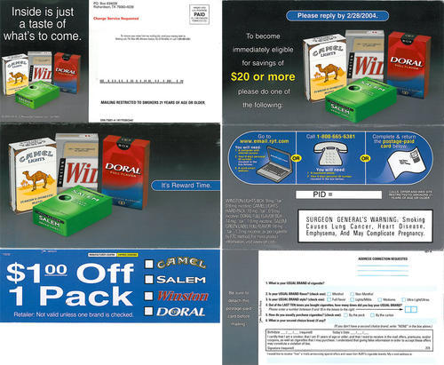 Direct mail in promotion of several RJ Reynolds brands including Camel, Winson, Salem and Doral. The piece includes a coupon for $1.00 off any of the brands and an offer to earn $20 or more in savings by mailing in an enclosed survey.