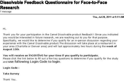 Email from RJ Reynolds asking the receiver to participate in an interview about their experiences with Camel Dissolvables.
