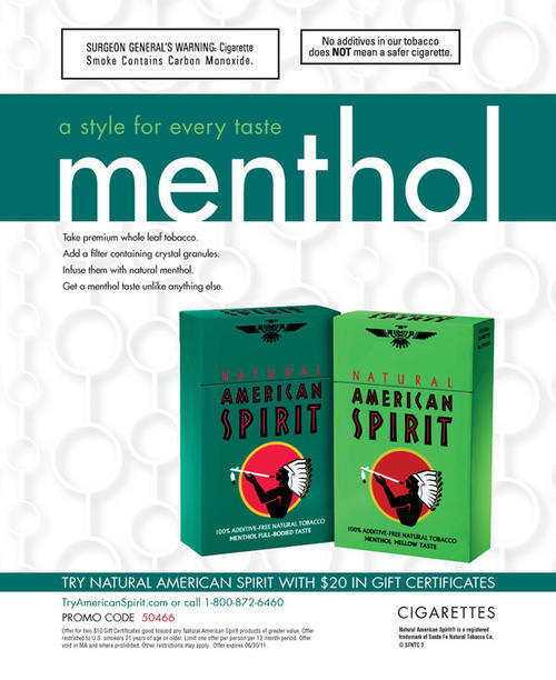 Ad for Natural American Spirit menthol cigarettes, featuring images of the packs. "A style for every taste". Ad also includes an offer for $20 in gift certificates to try the product.