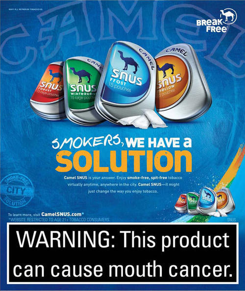 Ad for Camel Snus directed at smokers, positioning the product as a solution to city smoking bans. "Smokers, we have a solution".