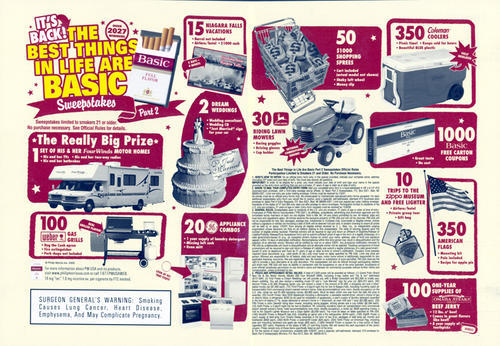 Ad in promotion of "The Best Things in Life are Basic" cigarette sweepstakes.