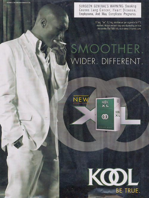 Ad in promotion of Kool's new XL wide pack. "Smoother. Wider. Different." Ad features an image of an African American man dressed in a white suit and smoking a cigarette.