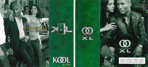Two sided ad in promotion of Kool XL wide pack. "Smoother. Wider. Different." Features an image of a couple leaning against a car in what appears to be a city street. Couple is well dressed and man can be seen holding a lit cigarette.