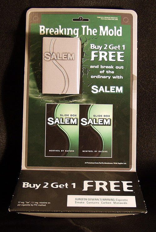 Salem "Breaking the Mold: Buy 2 get 1 free and break out of the ordinary with Salem". Black and green table top display advertisement.