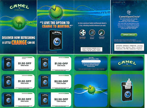 Direct mail in promotion of Camel Crush, including six product coupons. "Discover how refreshing a little change can be."