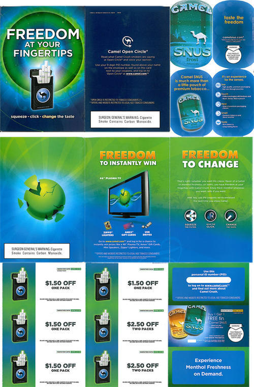 Direct mail in promotion of Camel Crush, including six product coupons. "Freedom at your fingertips." The piece also promotes a sweepstakes and a new smokeless tobacco product from the brand, Camel Snus.