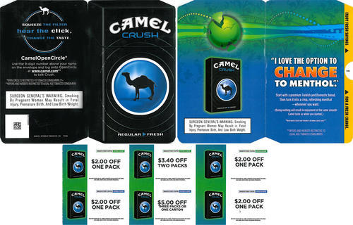 Direct mail in promotion of Camel Crush, in the shape and image of a pack of the new style. "I love the option to change to menthol." Mailings include up to six cigarette pack coupons.