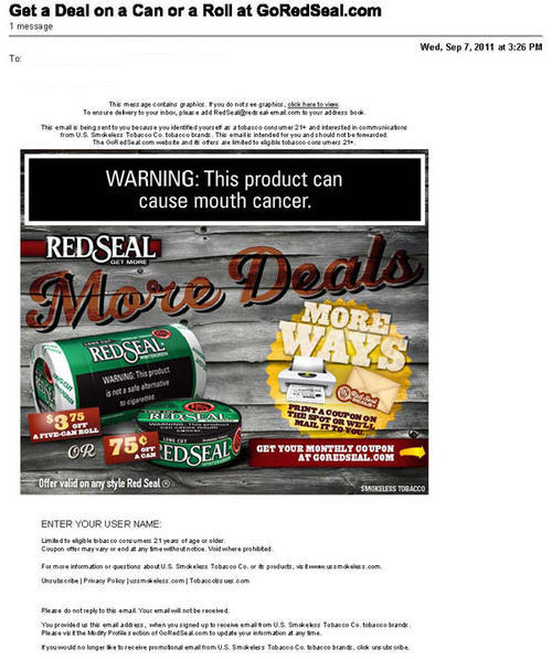 Email from Red Seal received in September 2011 directing the receiver to visit the brand's website in order to redeem a monthly coupon (for $0.75 off a can or $3.75 off a five-can roll).